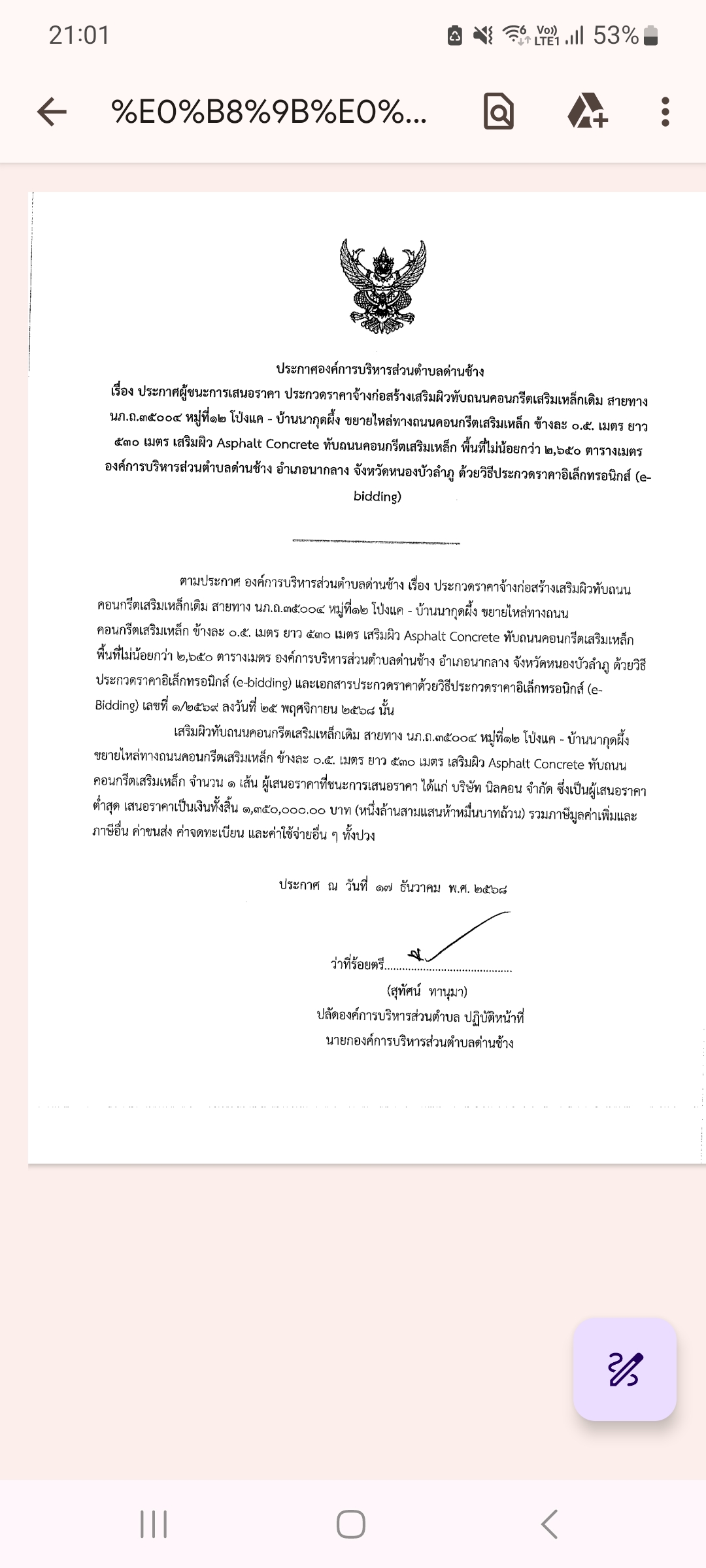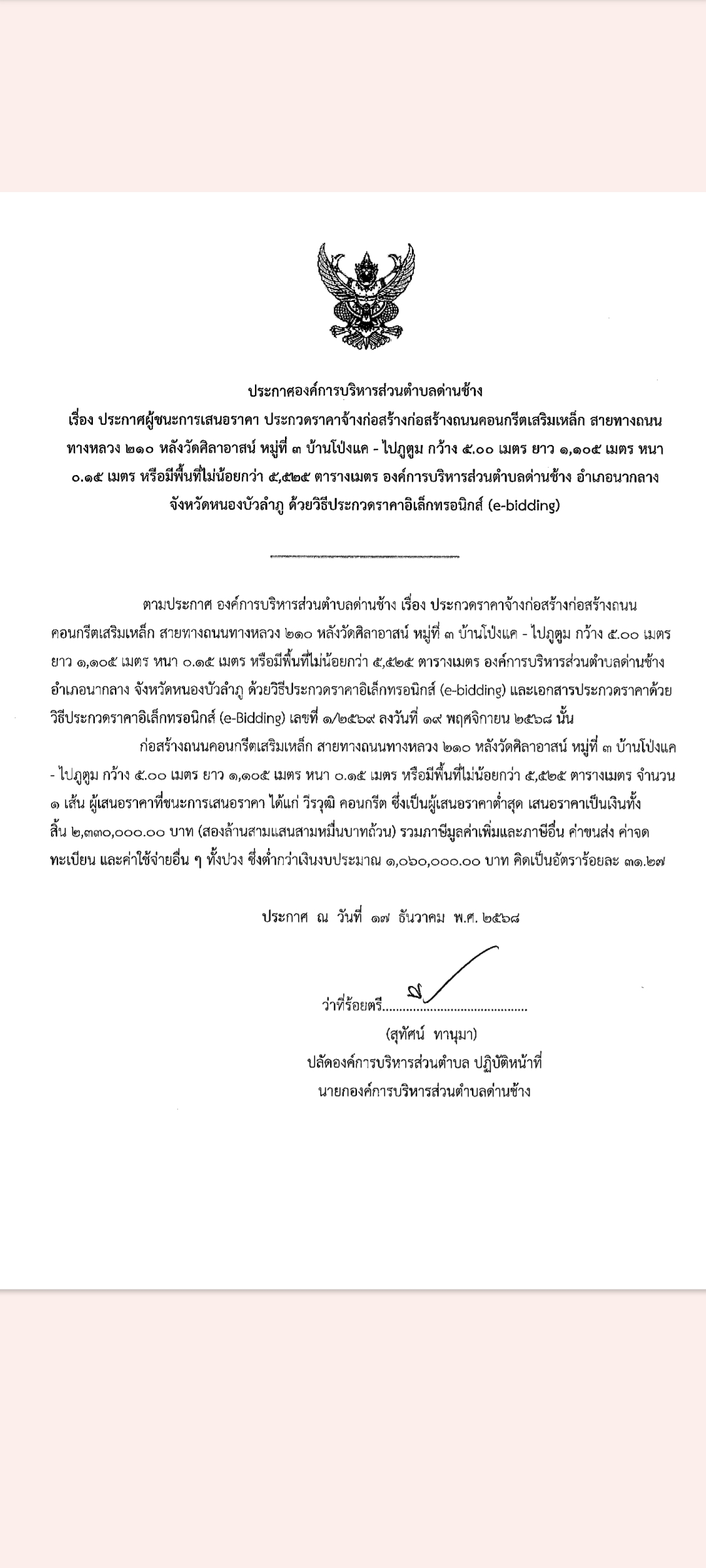 เรื่อง ประกาศผู้ชนะการเสนอราคา ประกวดราคาจ้างก่อสร้างก่อสร้างถนนคอนกรีตเสริมเหล็ก สายทาง นภ.ถ.๓๕๐๐๙ แยก นภ.ถ.๓๕๐๐๗-เส้นทางโรงเรียนบ้านหนองเอี่ยน หมู่ที่ ๙ กว้าง ๕ เมตร ยาว ๑,๒๐๐ เมตร